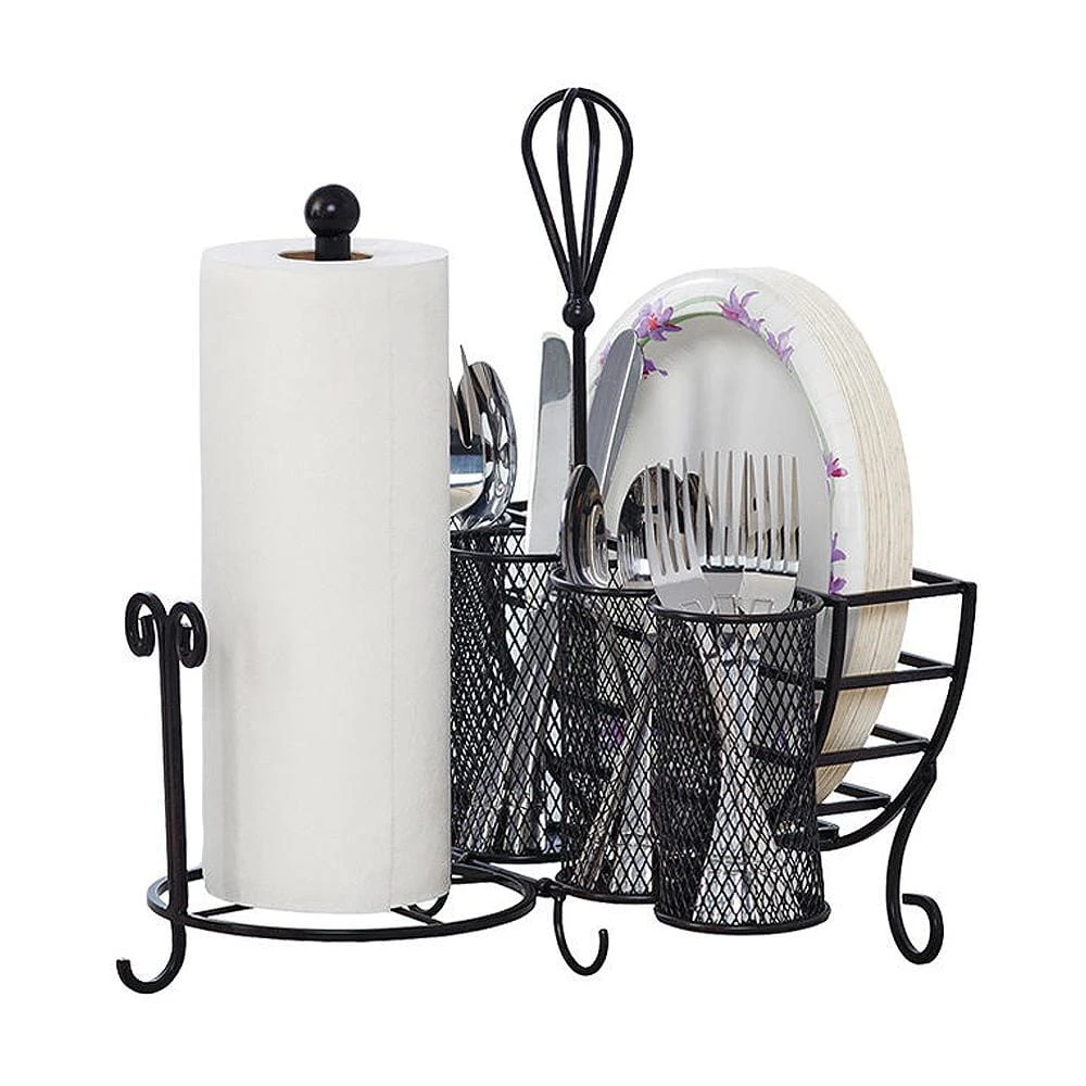 This Avilla Picnic Storage Caddy is a striking way to keep plates, flatware and paper towels organized and easily accessible to guests. Caddy features 4 flatware compartments, plate storage and a removable paper towel holder. Ideal for indoor and outdoor entertaining or any space saving need. Handcrafted from iron for long-lasting beauty even under rigorous use. Measures 13 inch long x 13 inch wide x 15 inch high; Plate and Flatware caddy measures 9-1/2 x 7-1/4 x 13 inches. Wipe clean with a damp cloth. Removable holder and paper towel rod for easy, compact storage.