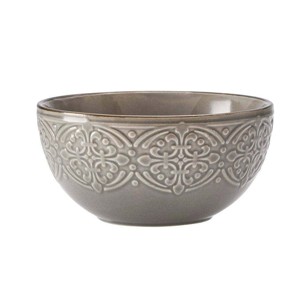 This Emma Dinnerware Set features embossed rims that are highlighted by a metallic edge detail, in neutral gray color, that will complement any table and is perfect for everyday dining or for adding a touch of sophistication to casual gatherings.