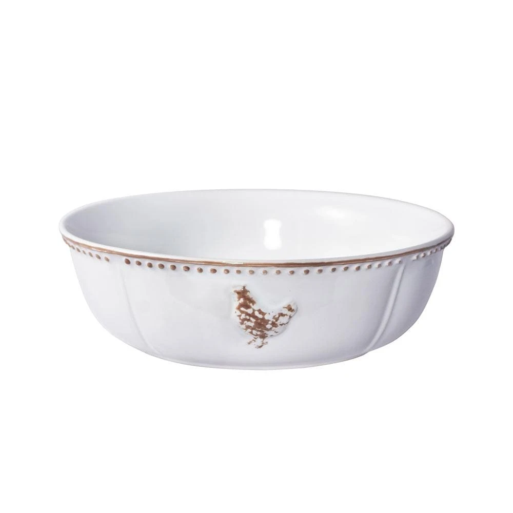 This Indivdual Pasta Bowl is accented with an antiqued rim and embossed hen, and features a wide shape that will make it a great go-to bowl for snacks and meals. Crafted of stoneware. Microwave and dishwasher safe. Individual Pasta Bowl measures 7-1/2 inch diameter x 2-1/2 inch high and holds 40 ounces.