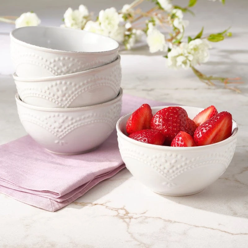 These bowls are perfect for cereal in the morning, salad at lunch and ice cream for dessert. Constructed of stoneware. Microwave and dishwasher safe. Set of 4 soup cereal bowls, each measure 5-1/2 inch diameter and hold 25 ounces.