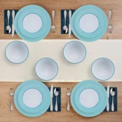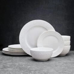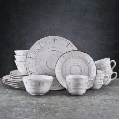 Crafted of stoneware. 16 piece dinnerware set, service for four, includes (4) each: 10-1/2 inch dinner plate, 7-1/2 inch salad plate, 5-1/2 inch diameter x 2-3/4 inch high (23 ounce) cereal bowl and 12 ounce mug. Microwave and dishwasher safe.