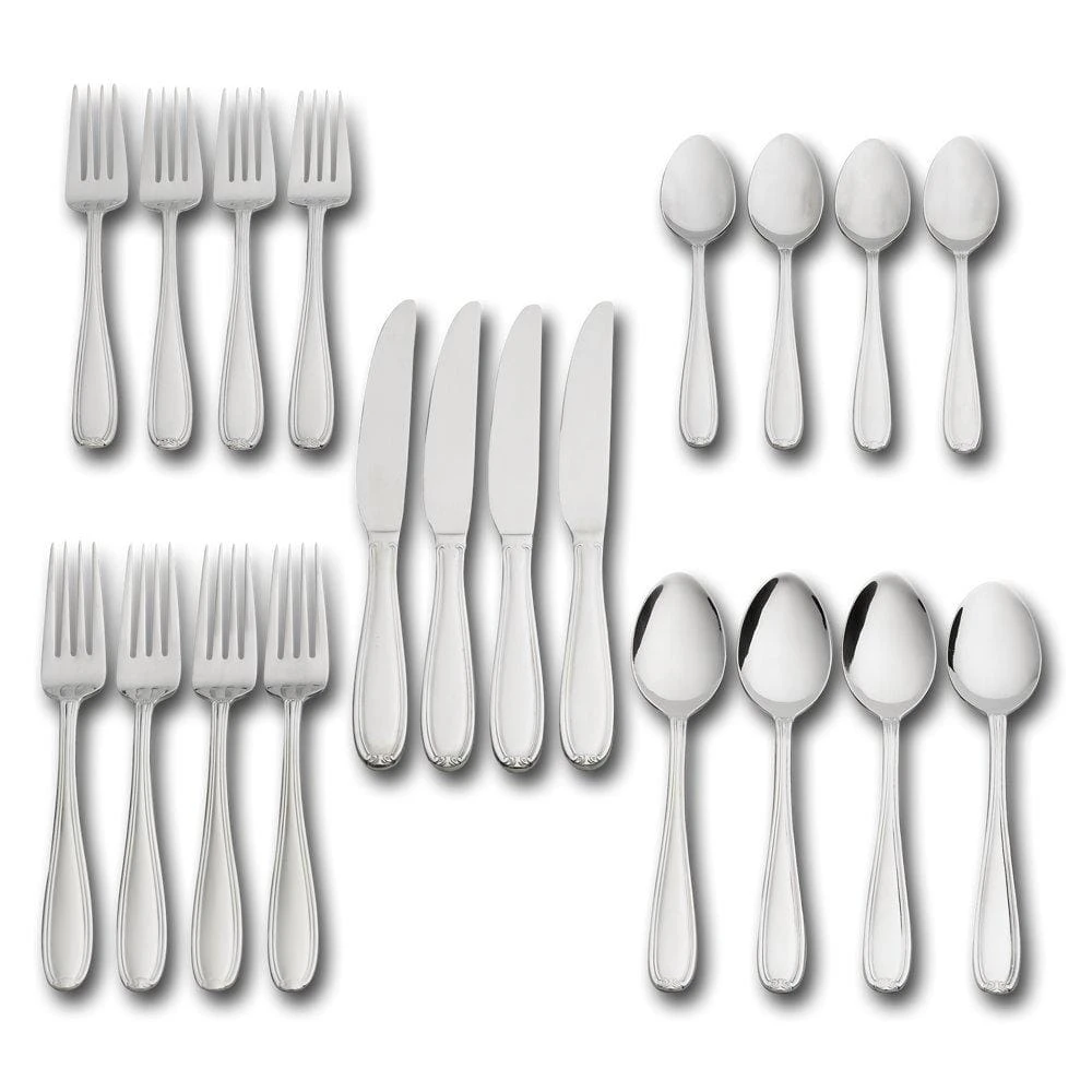 This Pfaltzgraff Linden Flatware Set exemplifies understated elegance. Its simple and functional styling coordinates with any place setting. Quality-crafted from 18/0 stainless steel to stand up to the rigors of everyday use. 20 piece set, service for four, includes (4) each of: dinner fork, salad fork, dinner spoon, dinner knife and teaspoon. Dishwasher safe.