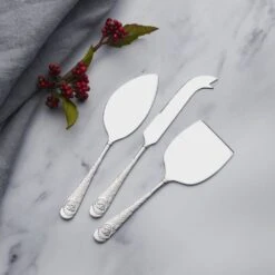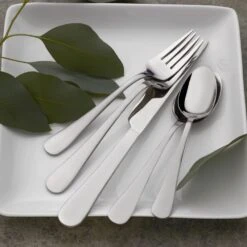 This Pfaltzgraff Nouveau Flatware Set features seemingly classic teardrop handles, with a distinct, raised vertical line down the center creating an angled touch, and stunningly polished to a vibrant sheen.