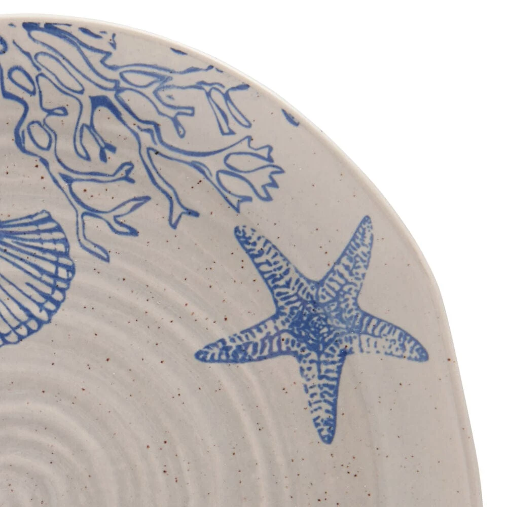 This Pfaltzgraff Southport Dinnerware Set features rustic, uniquely shaped pieces, with a gentle blue pattern of aquatic life that adorns the surface of each piece and a distinct speckled effect that brings to mind the curving edges of the ocean water as it washes over the sand. Note that due to the organic hand-crafted design, no two pieces are exactly alike and will exhibit slight variations in color and shape.