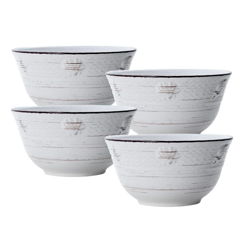 This Trellis Coastal White Set of 4 Soup Cereal Bowls feature a traditional intricate embossing with an antique finish, and combines the rustic elements of beautiful summer gardens with the allure of aquatic life.