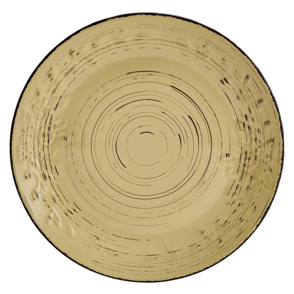 This Trellis Sunflower Dinnerware Set features a bold yellow background glaze with dark striations swirling around each piece, giving it a weathered, rustic look, and the rim is adorned with a subtle, embossed funflower design, making this a perfect set for everyday dining.