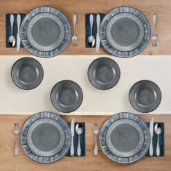 Crafted of Stoneware, featuring a reactive glaze. Due to the nature and hand-crafted qualities of reactive glaze, no two pieces are exactly alike and will exhibit unique variations in color and pattern. Product may slightly differ from image shown. 16 piece dinnerware set includes: (4) 11 inch dinner plate, (4) 8-1/2 inch salad plate, (4) 6 inch (22 ounce) soup cereal bowl and (4) 14 ounce mug. Microwave and dishwasher safe.