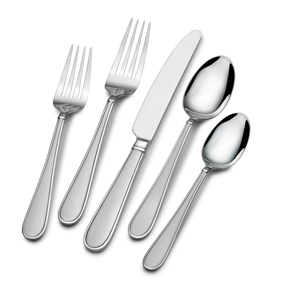 Gourmet Basics by Mikasa Westfield 45 Piece Flatware Set is crafted of 18/0 stainless steel. The pattern features slim handles that flare out to rounded ends, highlighted by a border line that adds depth. 45 piece flatware set, service for eight, includes (8) each: dinner fork, salad fork, dinner knife, dinner spoon and teaspoon, plus (1) each: tablespoon, pierced tablespoon, cold meat fork, sugar spoon and butter knife. Dishwasher safe.